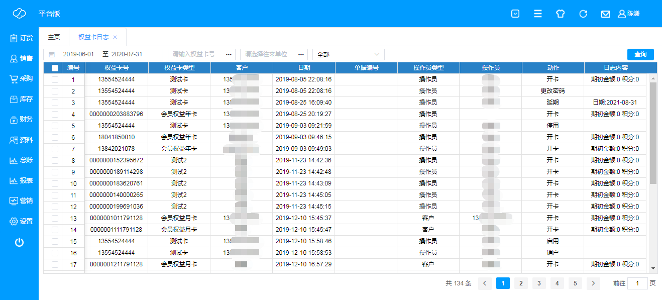 即查看所有权益卡变动表单,可根据单据日期范围、权益卡类型、往来单位以及动作(全部/开卡/充值/充次/退次/延期/项目延期)进行查询;