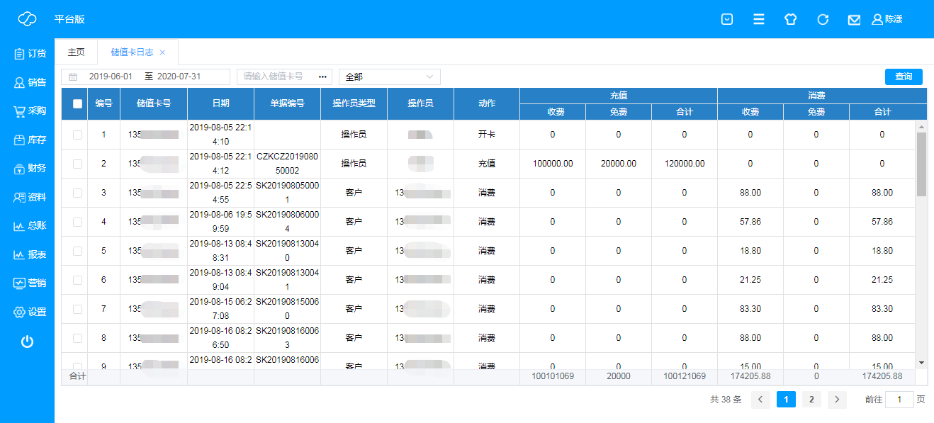 即查看所有储值卡变动表单,可根据单据日期范围、储值卡卡号以及动作(全部/开卡/修改期初/充值/修改密码/消费)进行查询;