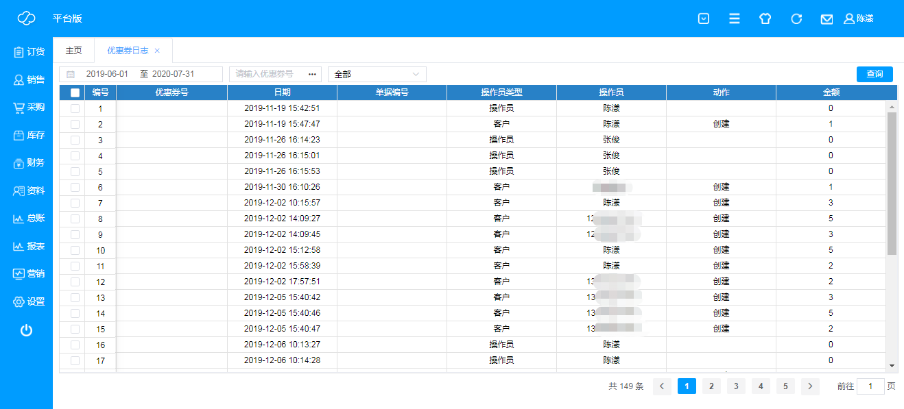 即查看所有优惠券变动表单,可根据单据日期范围、优惠券号码以及动作(全部/创建/充值/消费)进行查询;