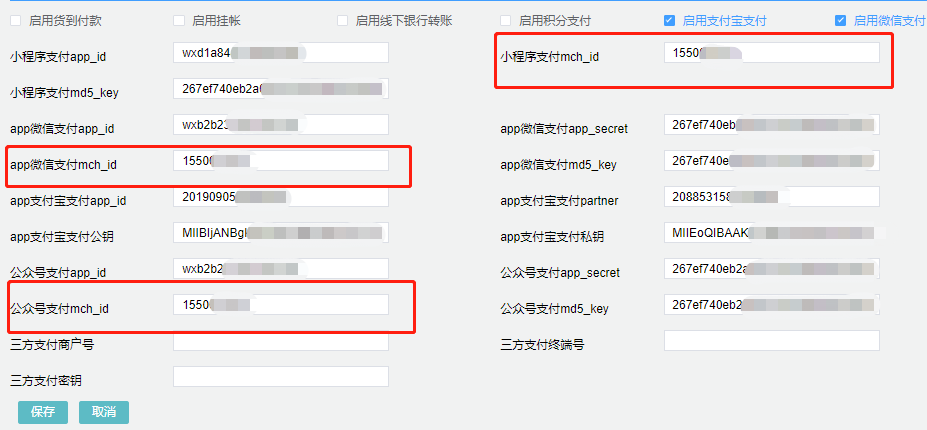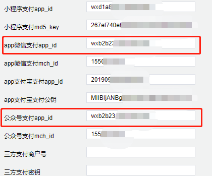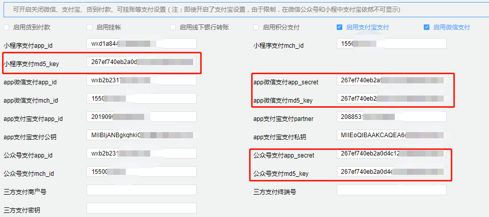 (2) 、app微信支付app\_secret 、 app微信支付md5\_key 与公众号支付app\_secret 、 公众号支付md5\_key 与 小程序支付md5\_key 内容一致;