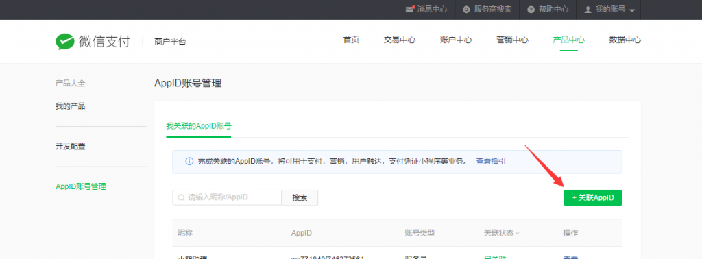首先在商户号后台——【AppID账号管理】——点击【关联AppID 】