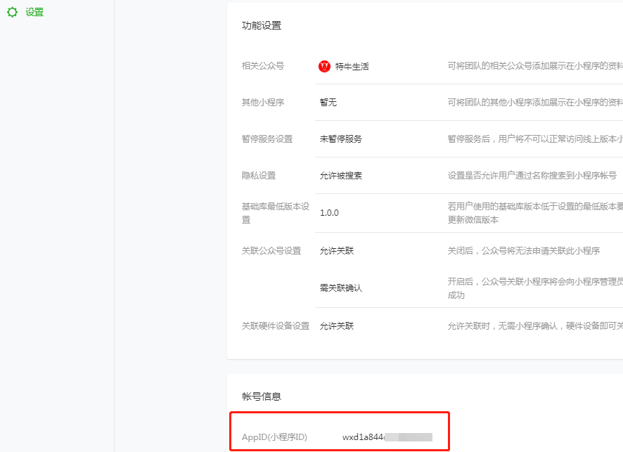 (8) 、小程序支付app\_id 查询: 登录微信小程序后台,网址 https://mp.weixin.qq.com/ ,左侧导航底部设置-基本设置,下拉查看账号信息,复制APPID,粘贴到云涛软件后台对应位置;