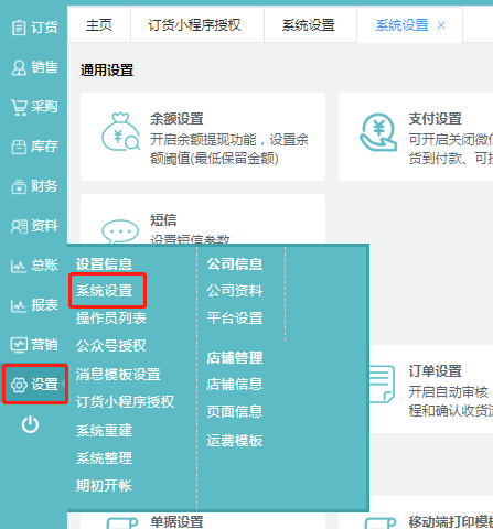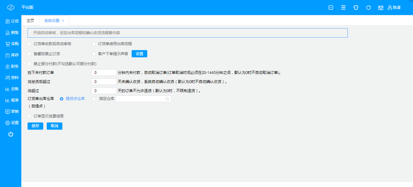 B、 订单设置:用于设置订单相关信息,设定出库流程和确认收货流程等内容;