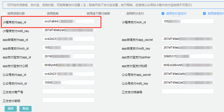 (9) 、全部粘贴完毕后保存即可完成微信相关支付设置工作。由于相关限制,微信端即使设置了支付宝支付依然无法显示,支付宝支付目前只有使用APP和网页时方可显示;