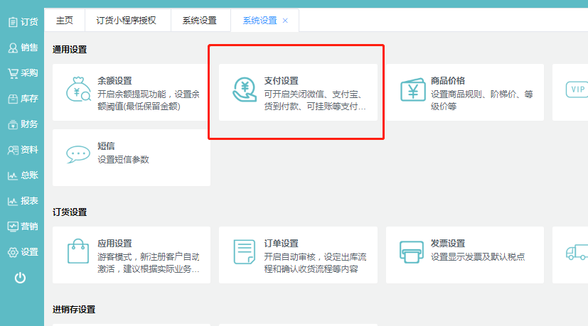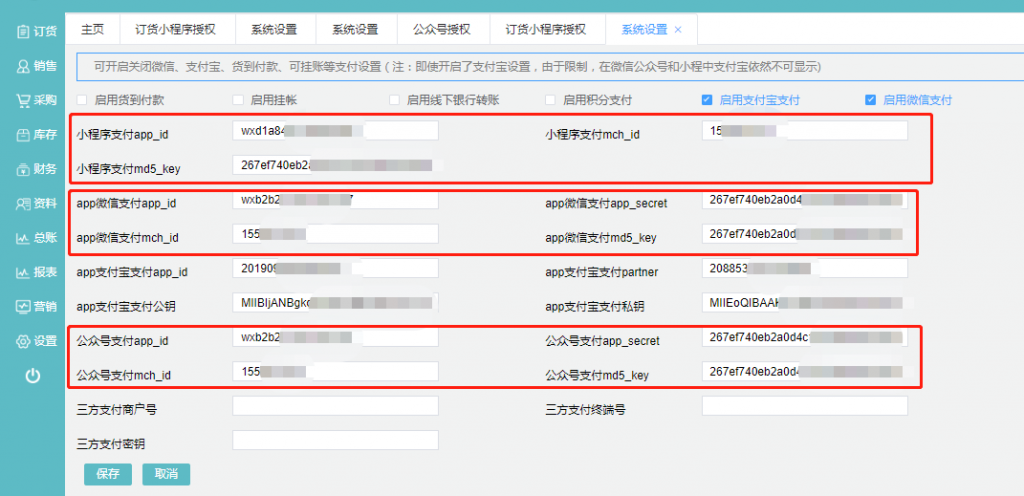 (b) 、完成授权公众号和小程序后,开始配置微信支付;进入云涛软件后台:设置-系统设置-支付设置;