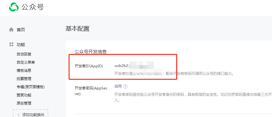(5) 、公众号支付app\_id 查询:登录微信公众号后台,网址 https://mp.weixin.qq.com/ ,找到左侧底部开发选项-基本配置,复制APPID字符串,粘贴到云涛软件后台对应位置;