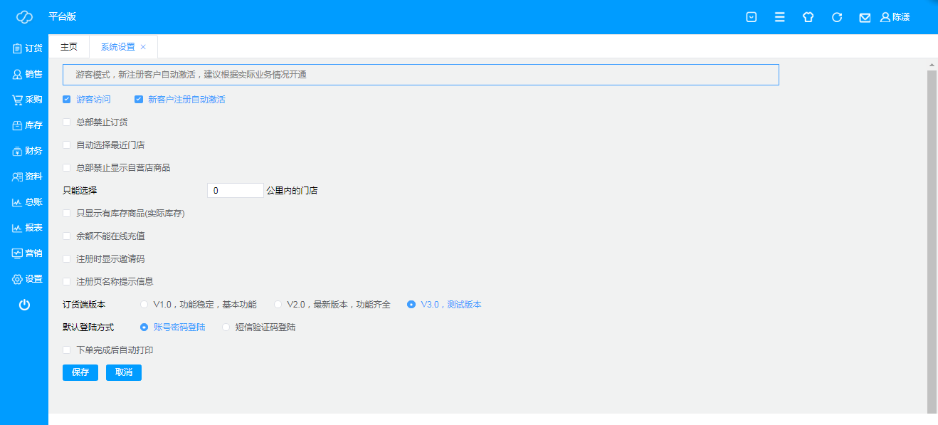 A、 应用设置:用于设置订货端的辅助信息、订货端版本(本说明适用于3.0版本)、默认登录方式以及打印等,可根据实际情况进行设置;
