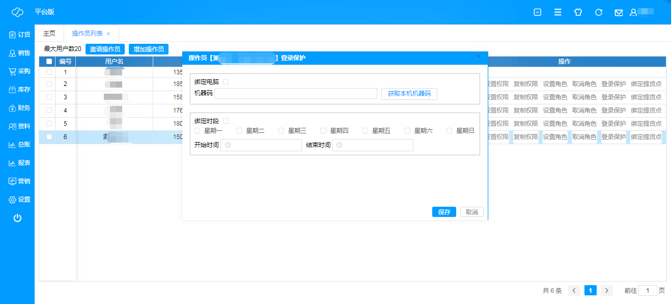 ·**登录保护**:即设置操作员的限定登录电脑,以及登录时间段,对操作员的登录进行限制及保护;