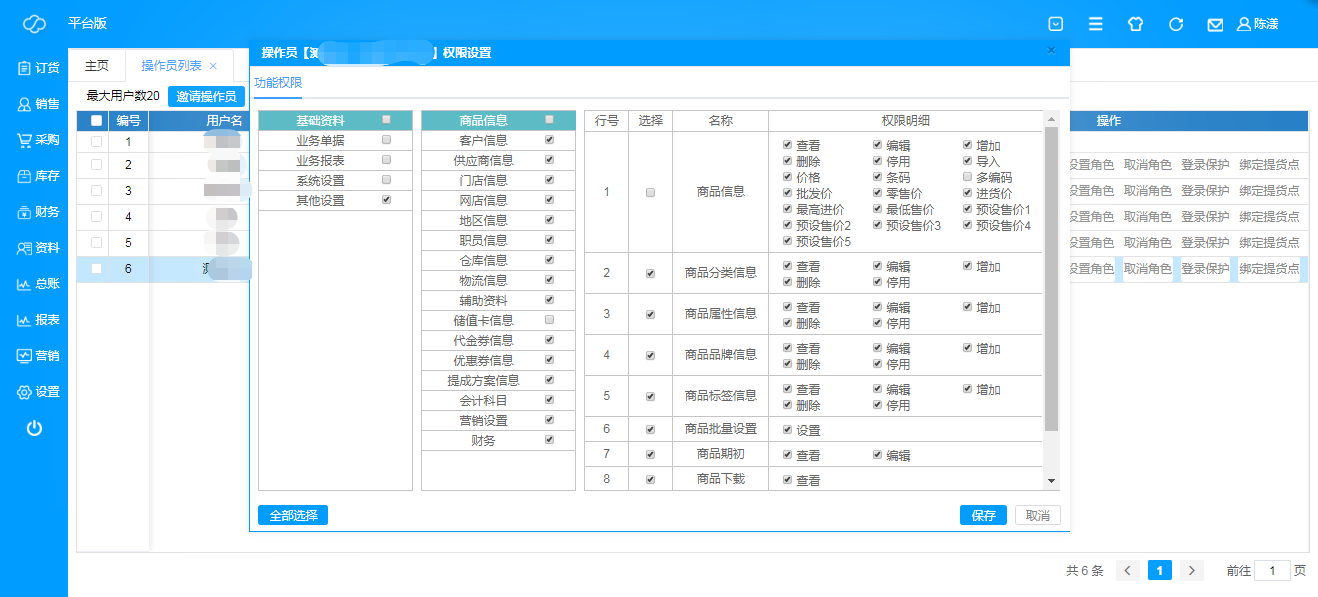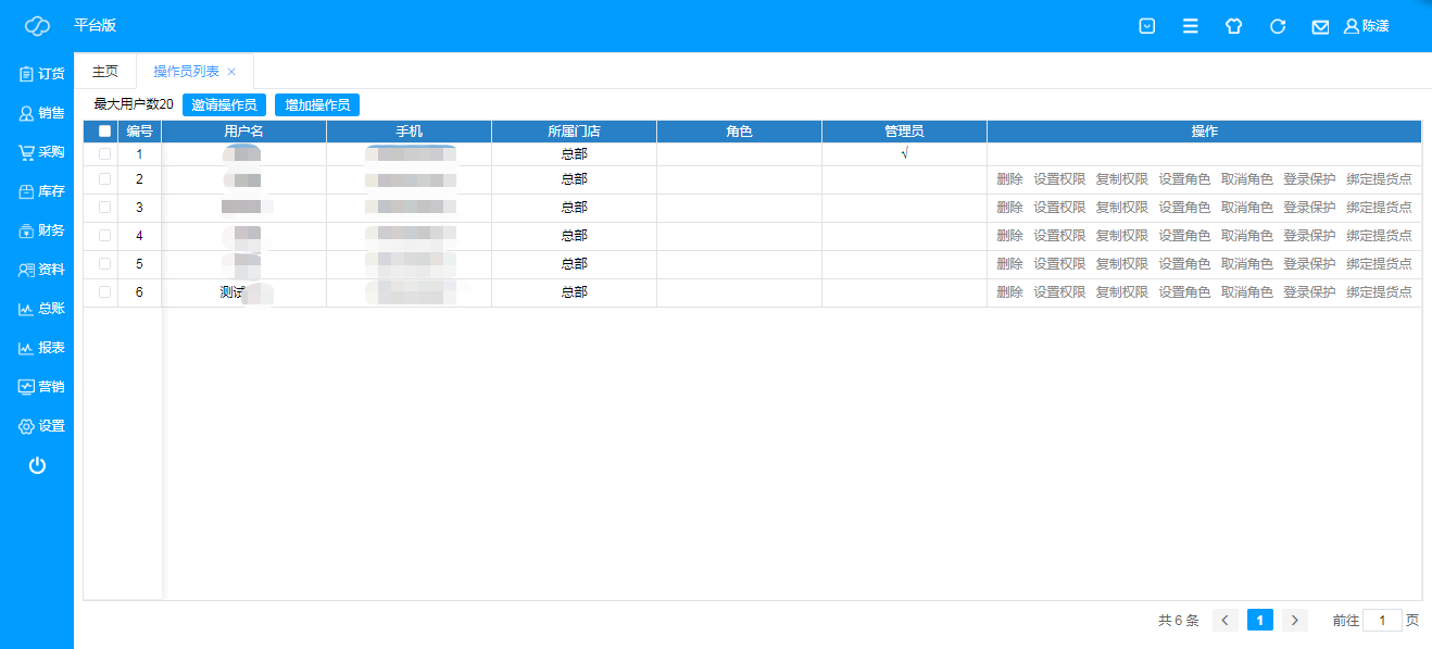点击对应操作员“设置权限”,根据实际情况设置操作员权限即可;