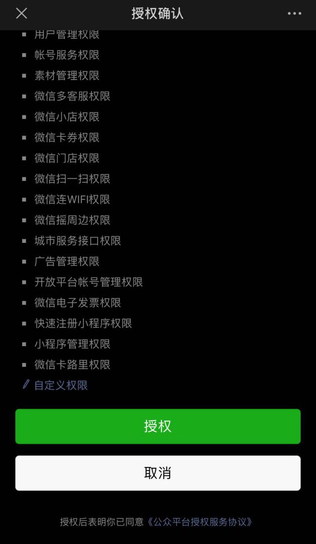 点击“授权”,默认跳转公众号授权,用公众号公众平台绑定的管理员个人微信号扫描二维码,并在手机端点击授权;