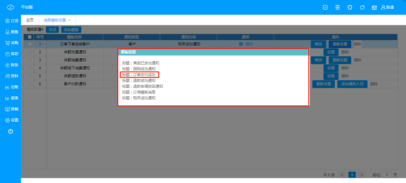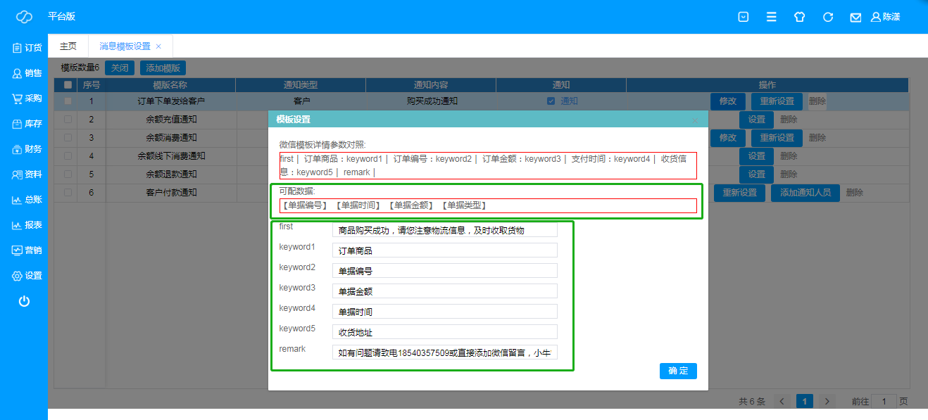 即客户付款,自动回复消息模板设置,设置前需确定已关联公众号(服务号);