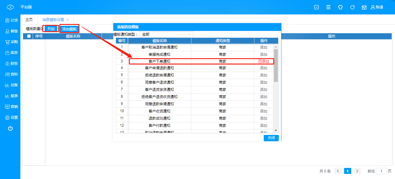 C、 点击“添加模板”,选择通知类型,点击添加;