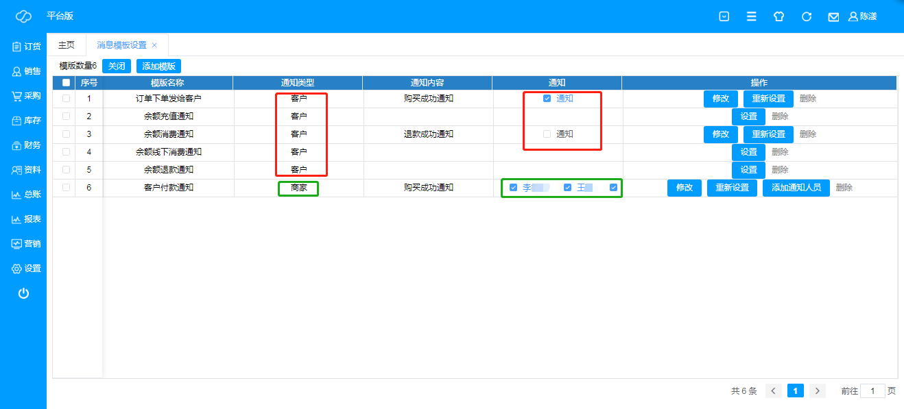 F、 点击“通知”对话框,即可完成通知;注:通知给客户的只需要点选“通知”即可,通知给商家的,需要选择具体通知人;