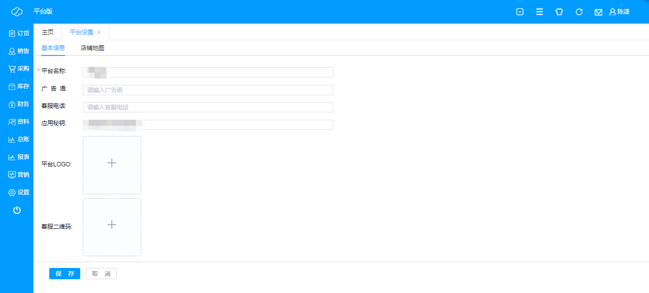 即设置订货平台的基本信息,包括名称、广告语、客服电话、应用密钥、平台logo、客服二维码以及店铺地图等信息;