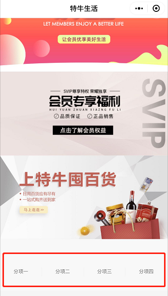 O、 优惠券模块:用于设置优惠券模块,但样式颜色暂时固定换不了,如果想用别的样式,可以自己做图片再用跳转页面中的“领优惠券”实现;