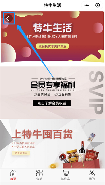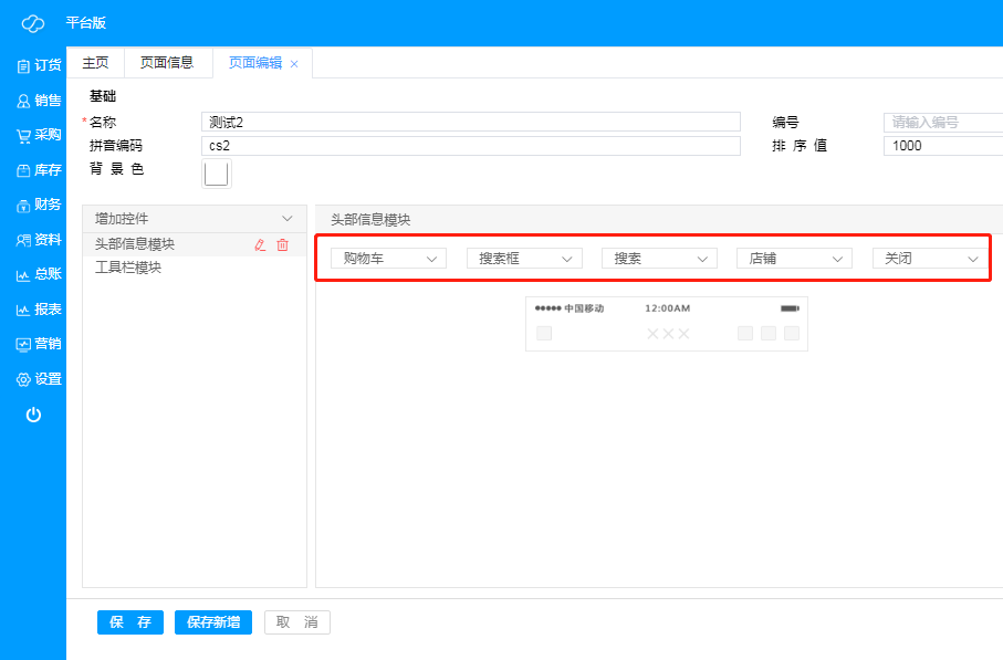 J、 返回按钮:直接添加返回按钮,一般需要把该模块放在所有模块最上方,订货端则会在页面左上角,但位置可以更改,可根据实际情况进行更改,暂时不能更改颜色字体,订货端点击默认返回上一页;