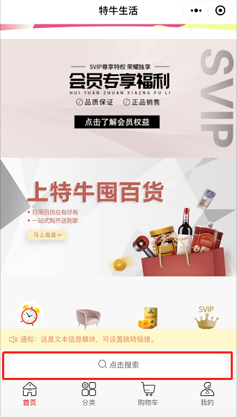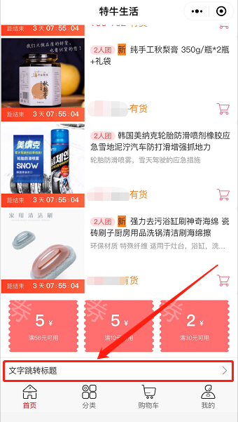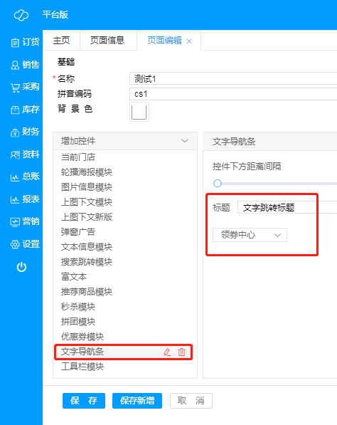 A、 文字导航条:用于展示用文字表述的跳转,可跳转微页面、商品、门店、订单、优惠券等等各种内容;