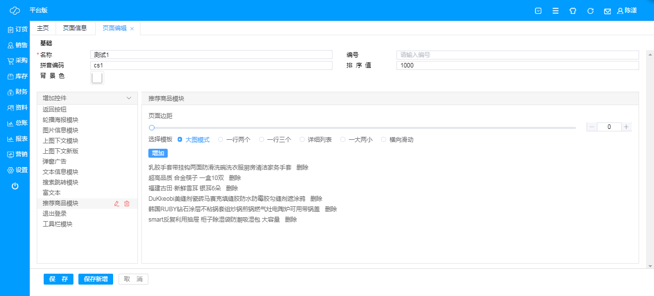 L、 推荐商品模块:用于设置商品模块,可以选择需要展示的商品,商品展示方式(大图模式、一行两个、一行三个、详细列表、一大两小、横向滑动)等;