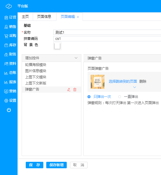 E、 弹窗广告:可设置弹出次数(只弹出一次/一直弹出),弹窗规则,放置位置不限,只有点击放置的页面的时候,弹窗才会出现;