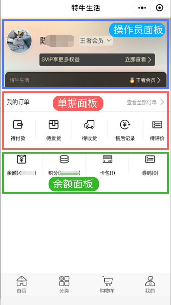 V、 余额面板:一般在“我的”页面搭建设置,展示余额、卡包、劵码等信息,具体位置如下图所示;