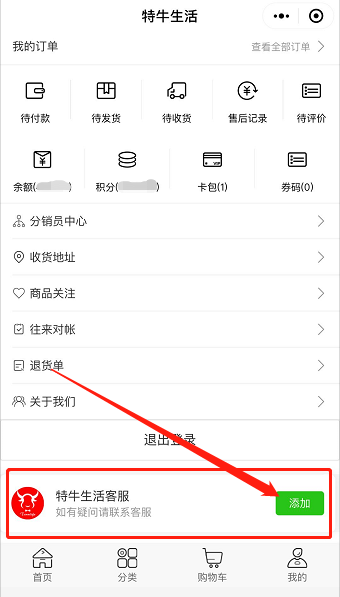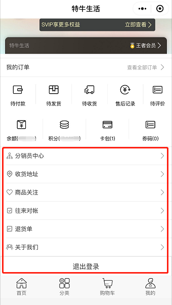 X、 我的面板:一般在“我的”页面搭建设置,展示所有可以在“我的”页面展示的内容,包括分销员中心、收货地址、商品关注、往来对账、退货单、关于我们,退出登录,且内容不可增减调序;