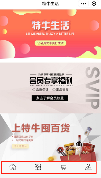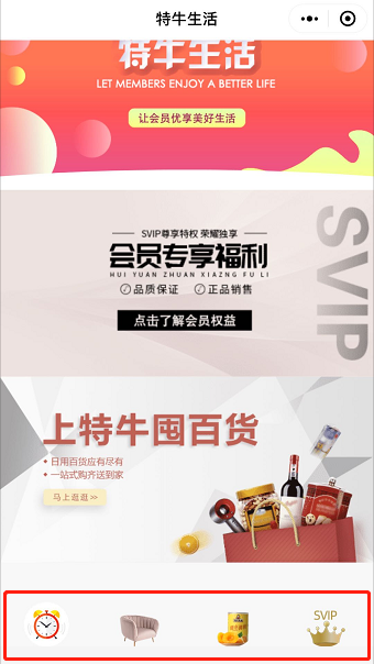 G、 工具栏模块:即底部工具栏,一般以一行3-5个为一组,可设置纯图片、纯文字、图片+文字三种展现样式,也可以更改背景颜色以及单独某个文字颜色,根据实际应用自行选择;