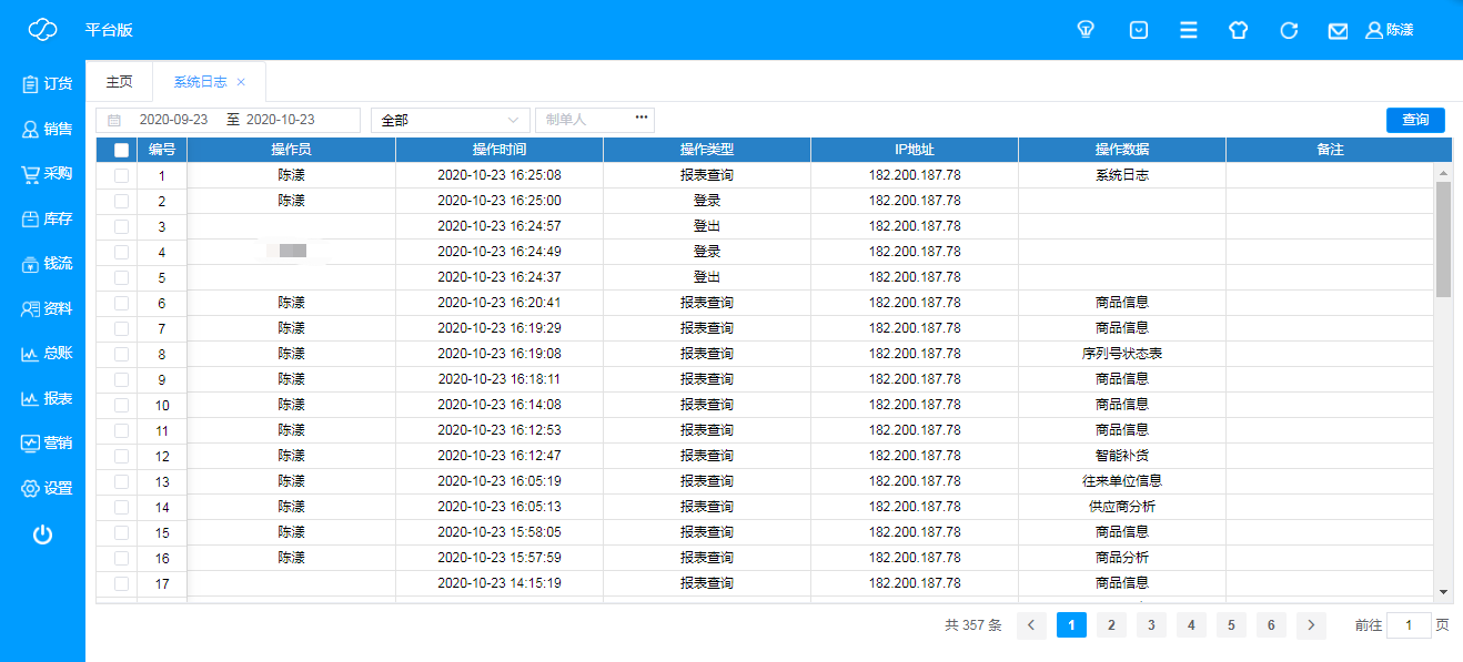 即查看所有操作员的系统操作情况,包括:时间、操作类型、电脑ip、操作数据等信息;