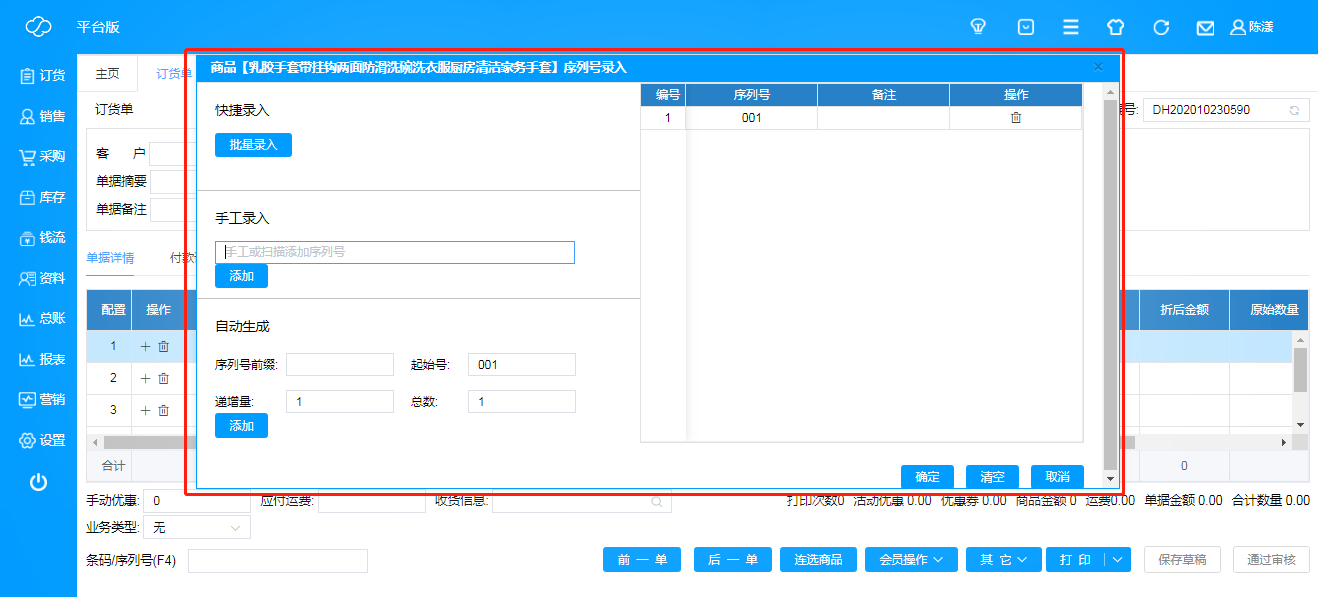 对于已启用序列号的商品,在制单时(包括订货单、销售单、采购单、退货单等所有单据情况)选择商品时(必须选择有序列号的商品所在仓库),可对商品序列号扫码(或手动输入)进行操作;