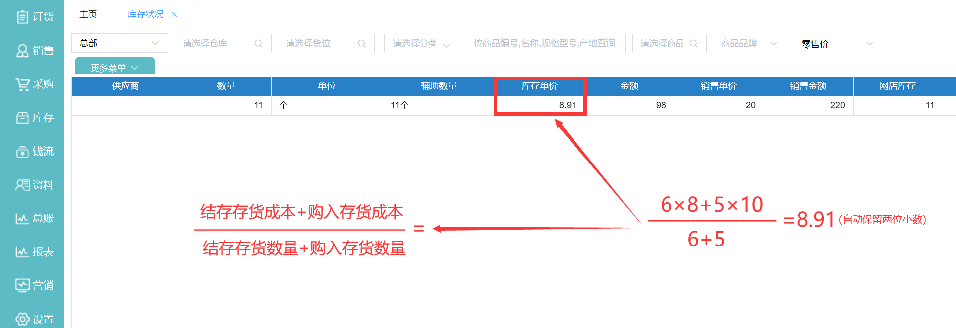 1.使用场景:我们以不同价格采购一批货后。我们在查看库存状况时(报表—库存状况)里面的库存单价这一栏并不是我们手工录入的,这里库存单价的计算用的就是加权平均法。