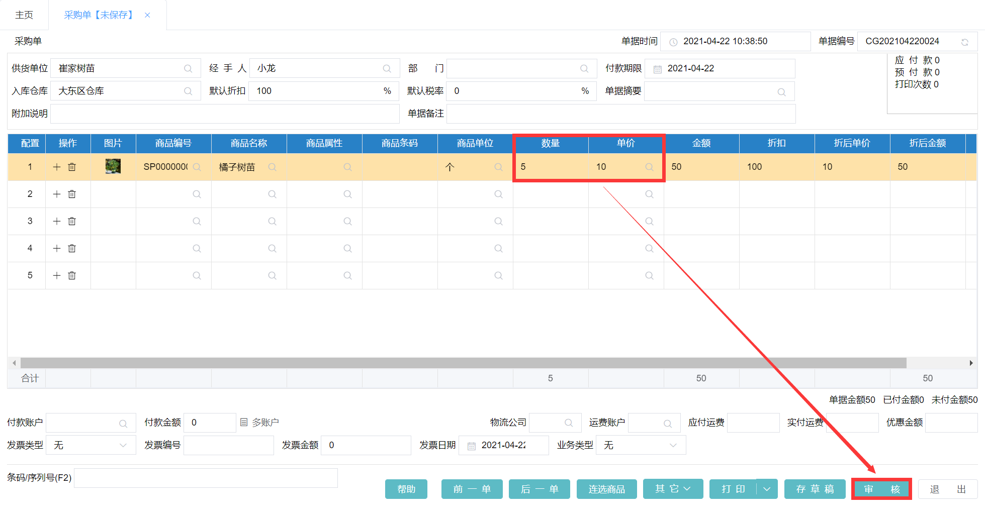 2)接着我们再采购5棵单价是10元的橘子树苗,录入采购单并审核。