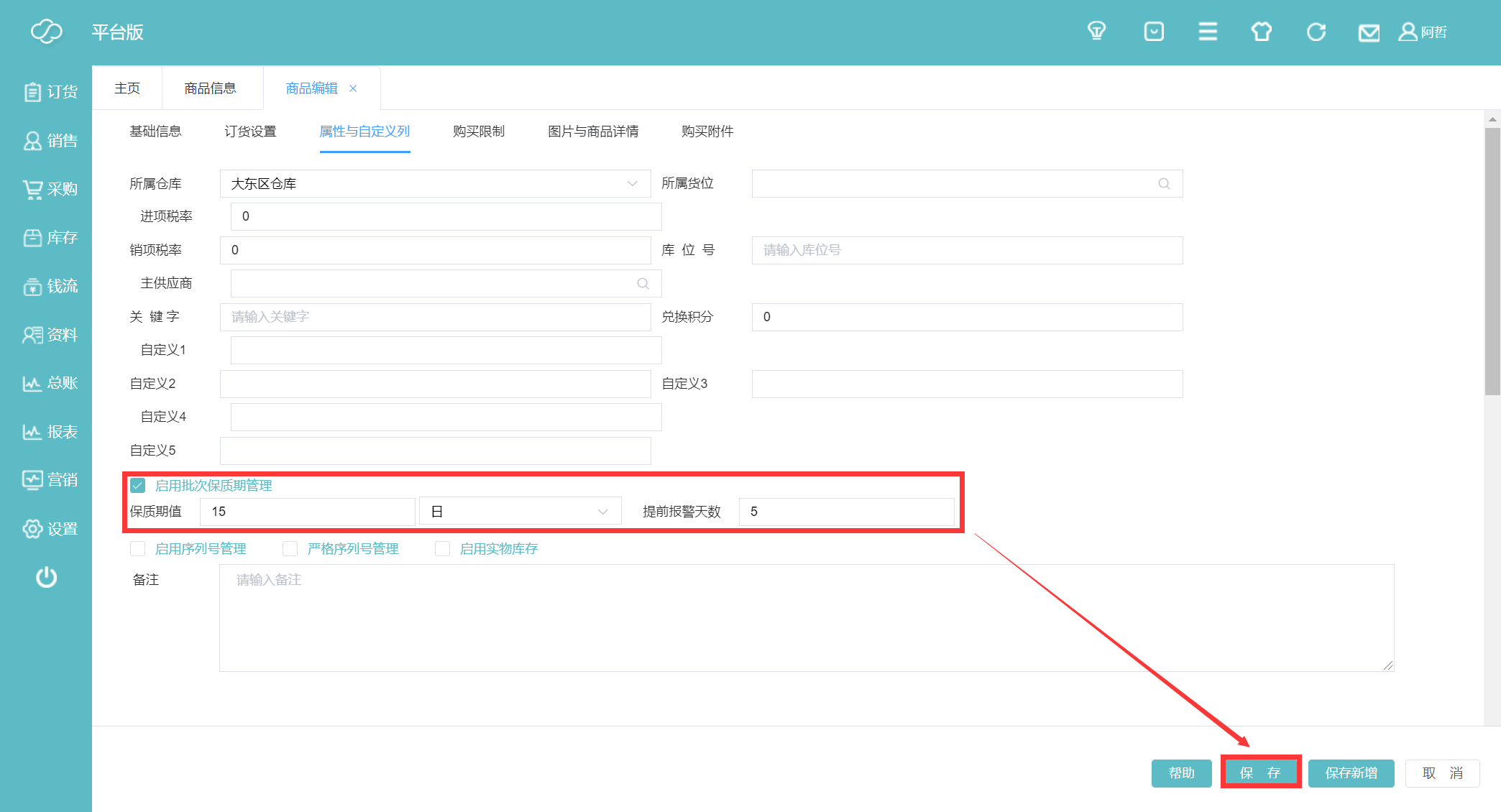 1.使用场景:当我们编辑商品信息时,启用属性与自定义列里的启用批次保质期管理后,我们录入采购单时不同批次的商品会分别录入,同批次的商品会录入到一起。