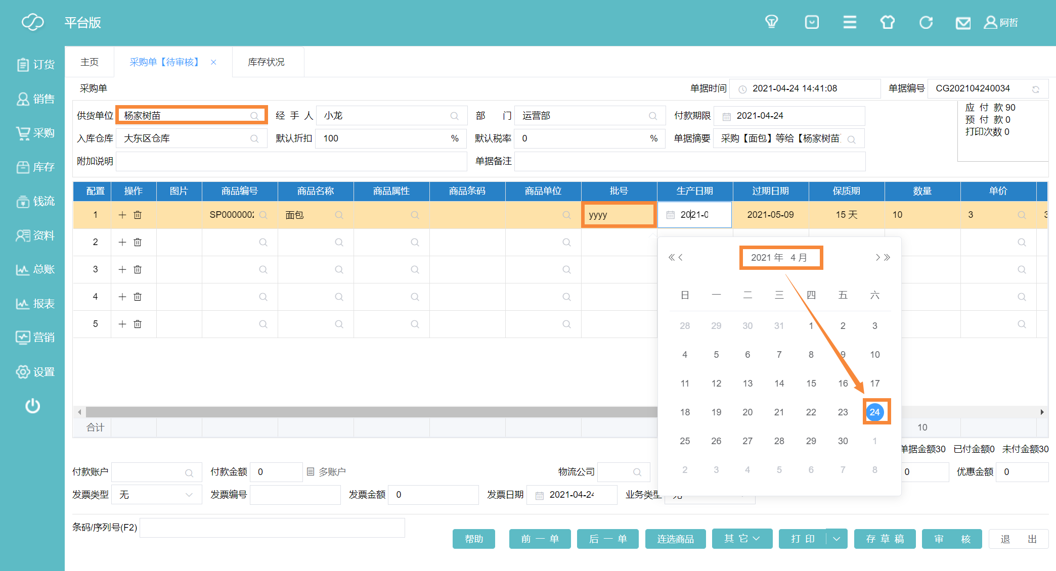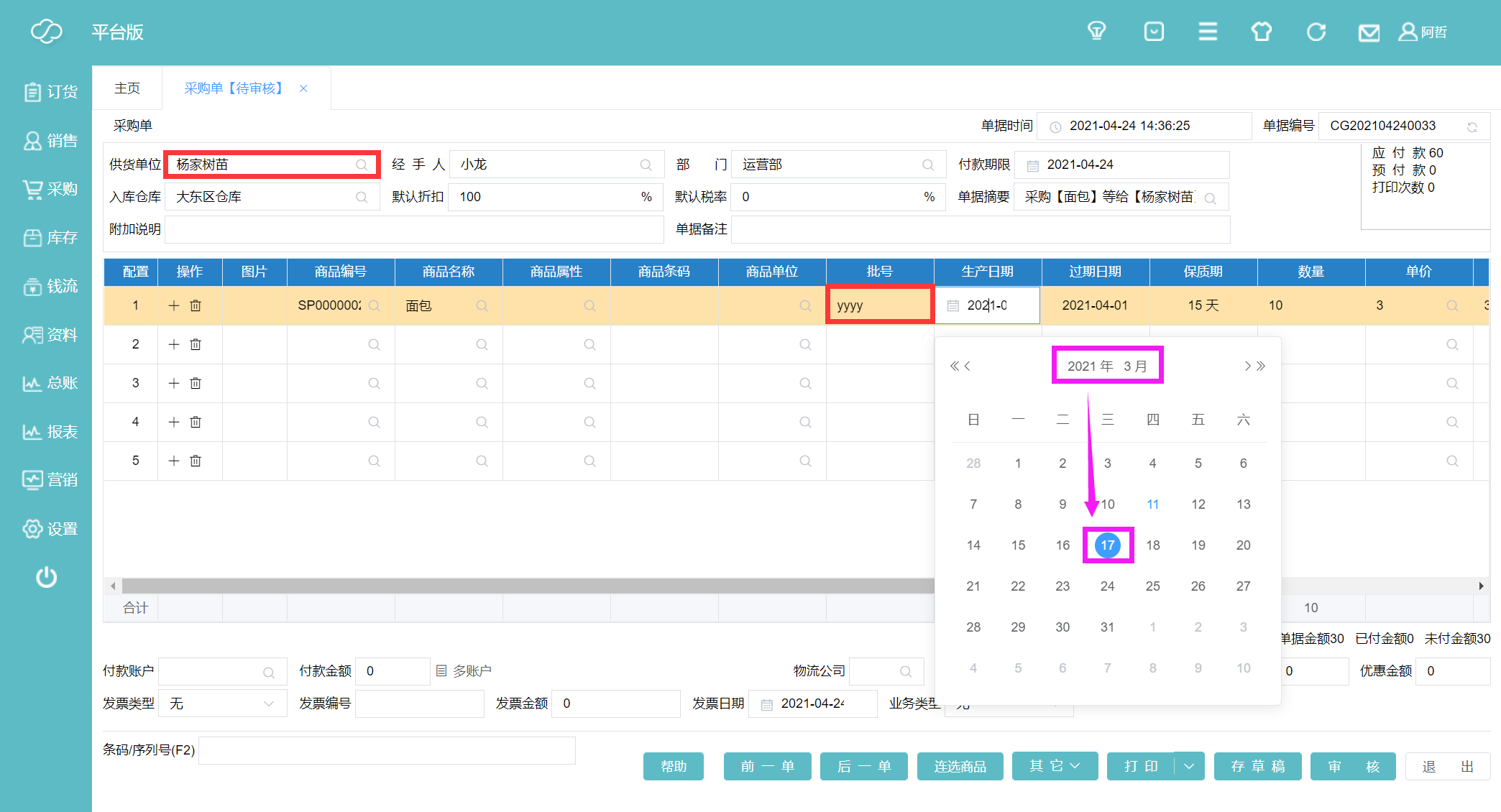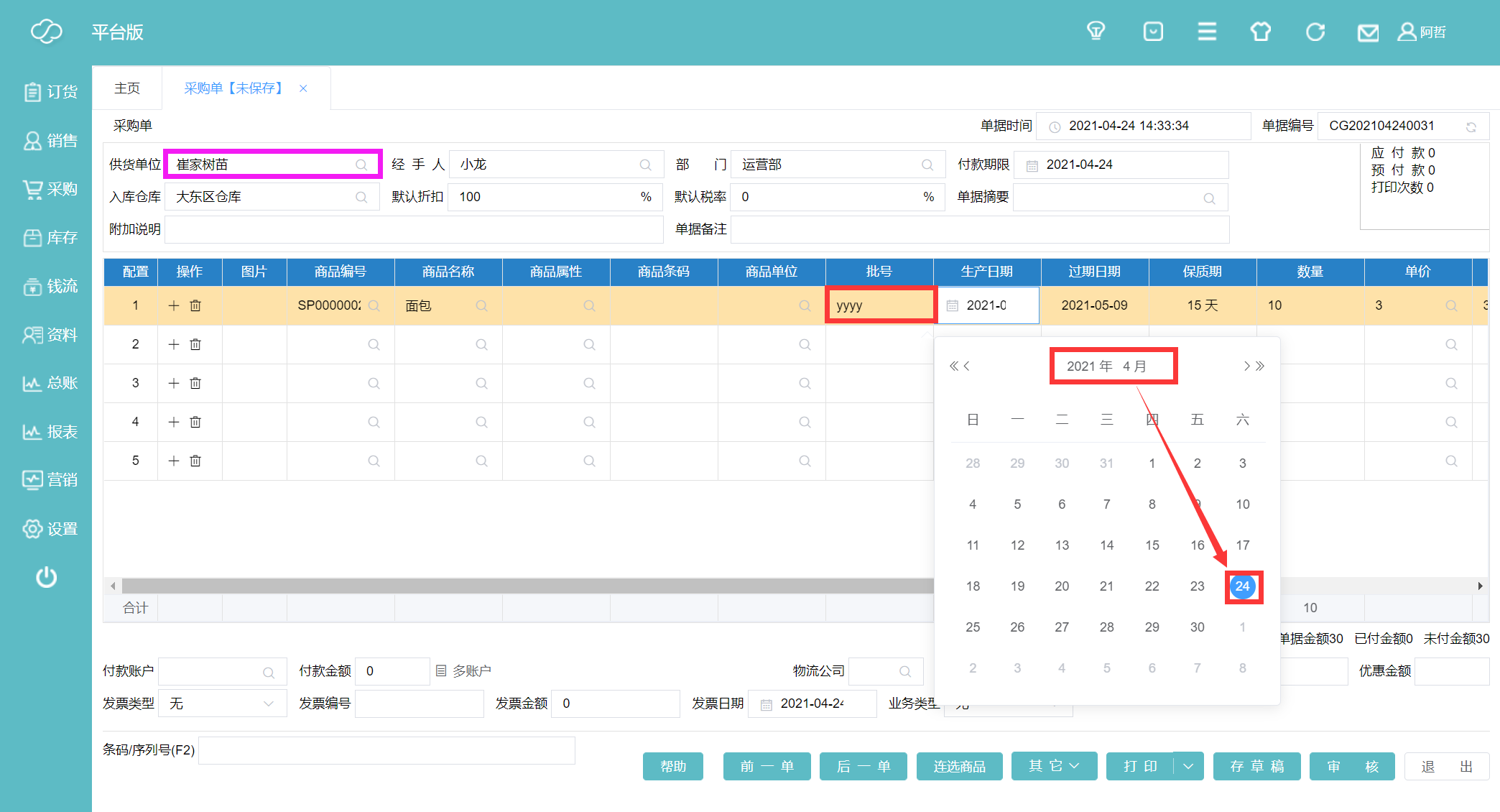 3)我们以面包为例,分别采购以下五批面包各10个录入采购单。