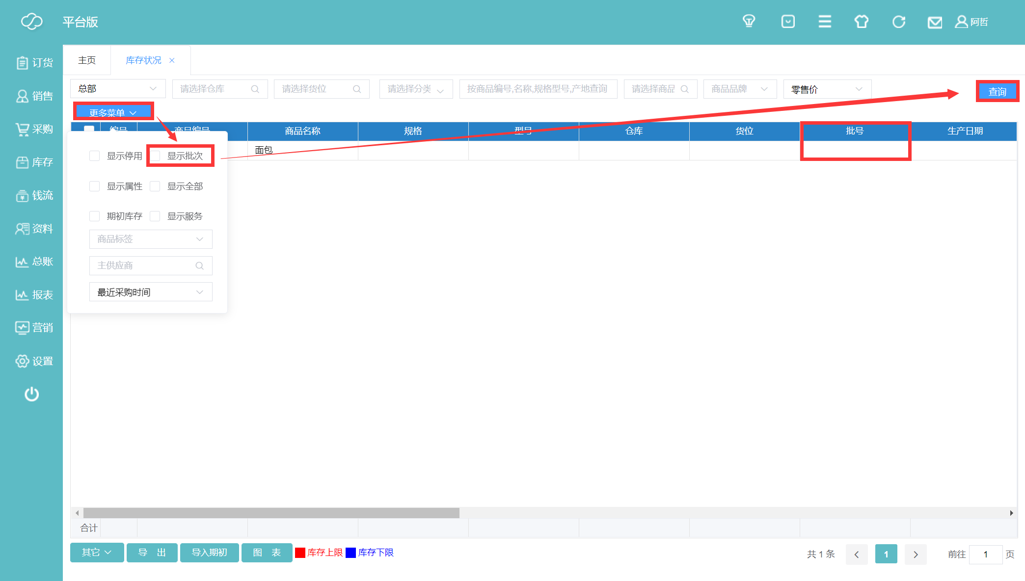 4)当我们查询库存状况(报表—库存状况)时,默认是不显示批次的,我们需要点击左上角的更多菜单,勾选上显示批次选项,然后点击右上角的查询按钮即可显示批次。
