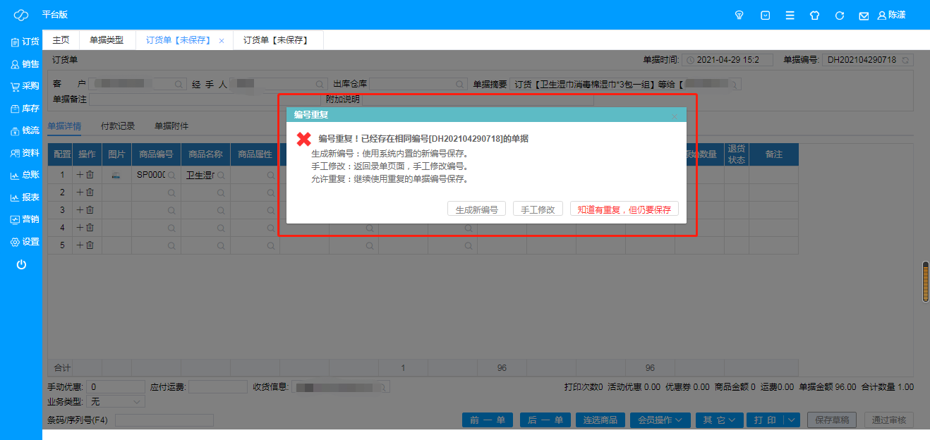 注:如在多操作员同时做单据时,生成单据两个一样的单据编号,此时必有一个单据保存不上,此时可以根据提示生成新单号、手工修改或者强制保存;