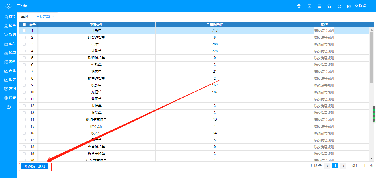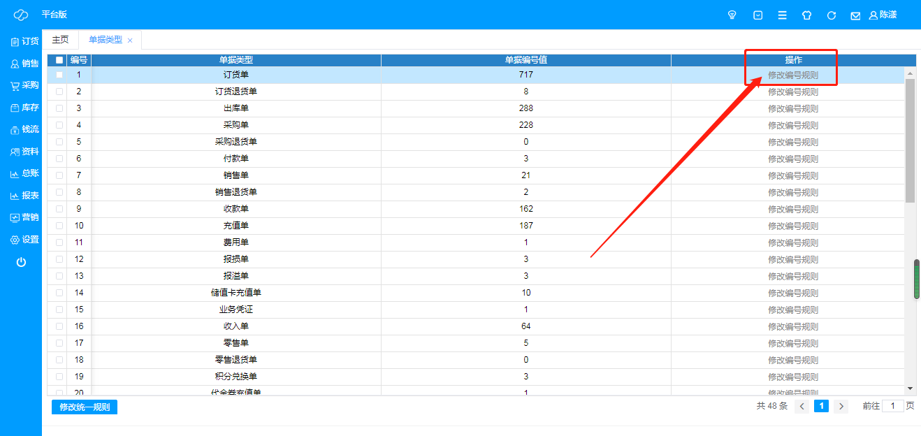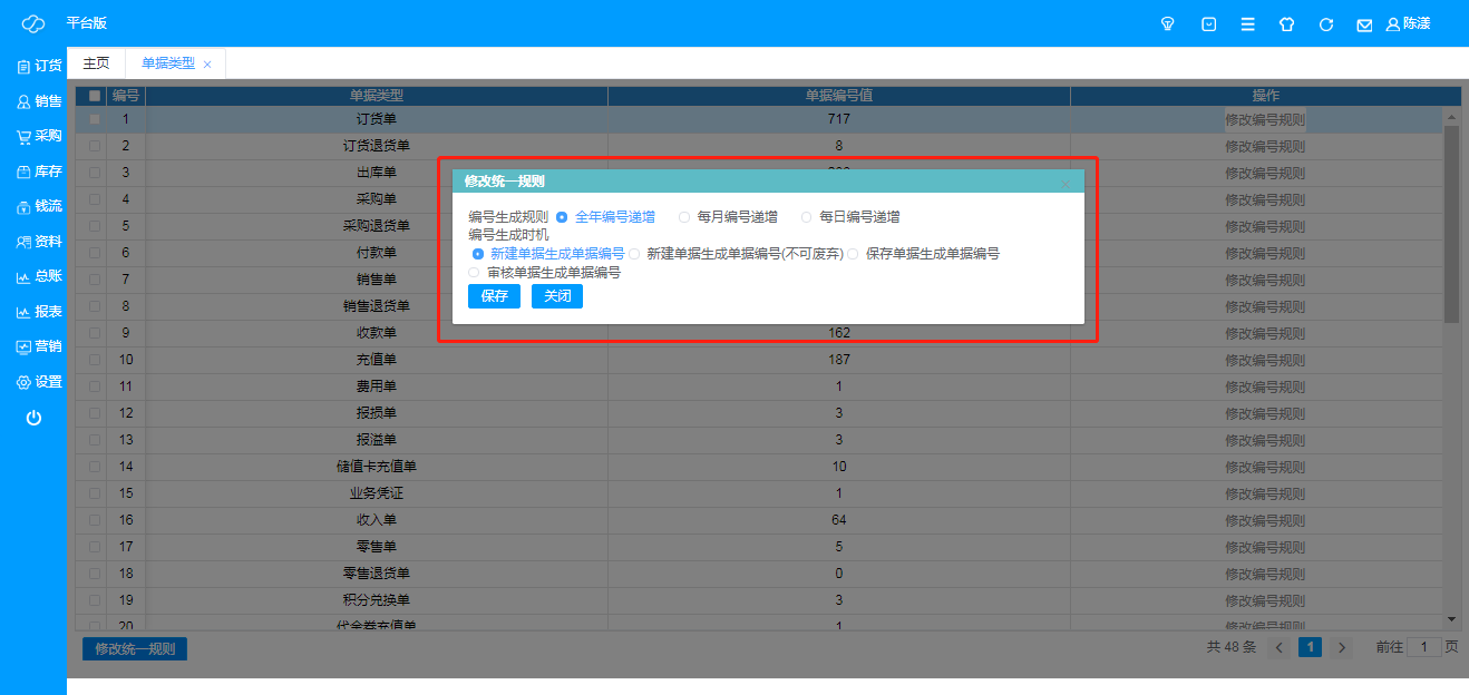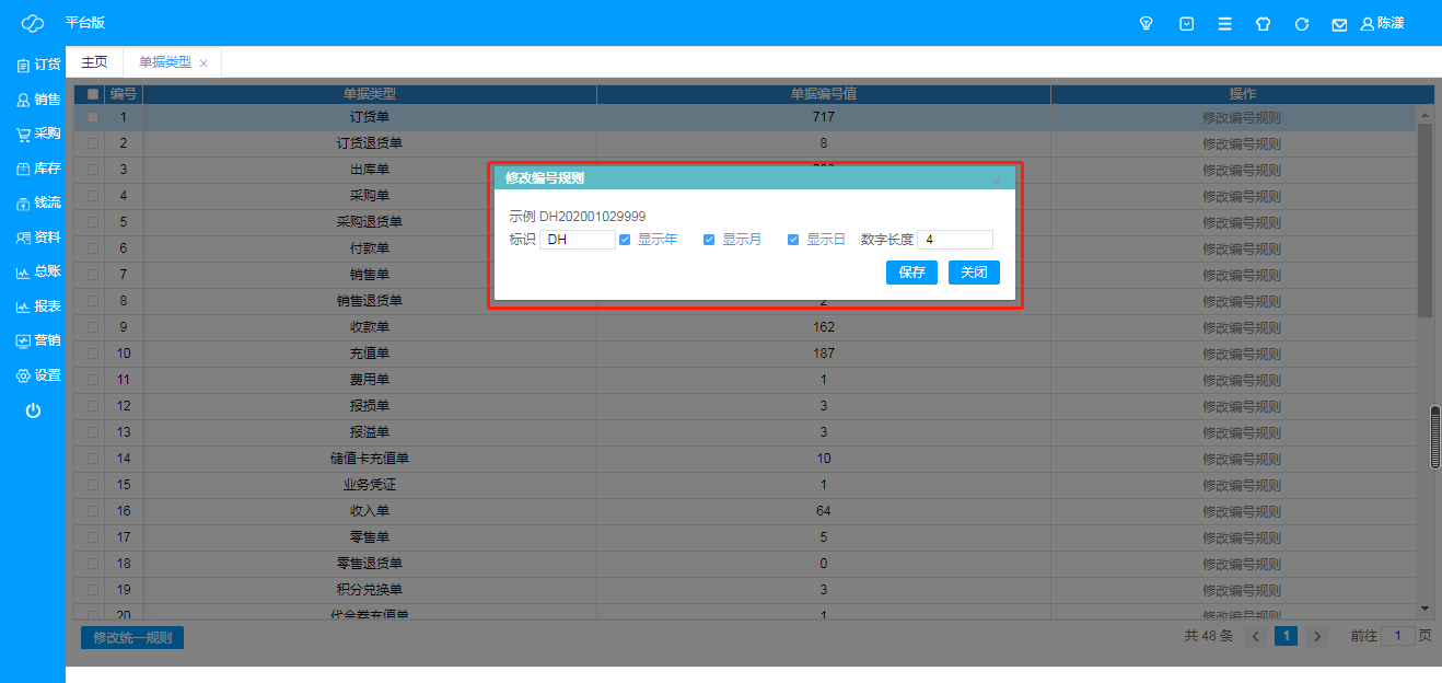 ·单据编号规则修改:可修改所有单据的默认编号的字段和规则以及单号的生成时间;