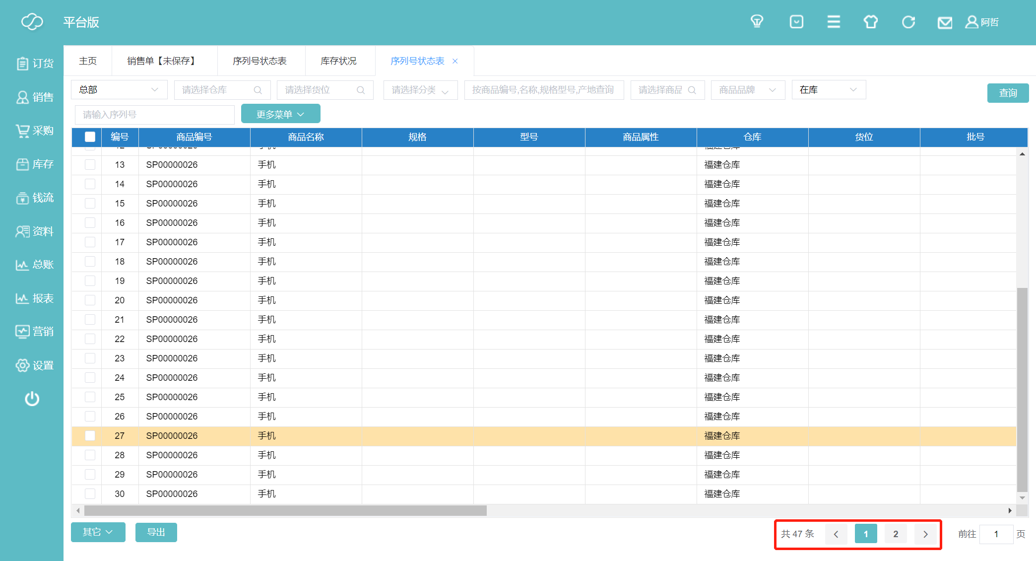 13、这里默认是显示在库的状态,刚刚我们销售了001~003,所以在库的只有004~050。