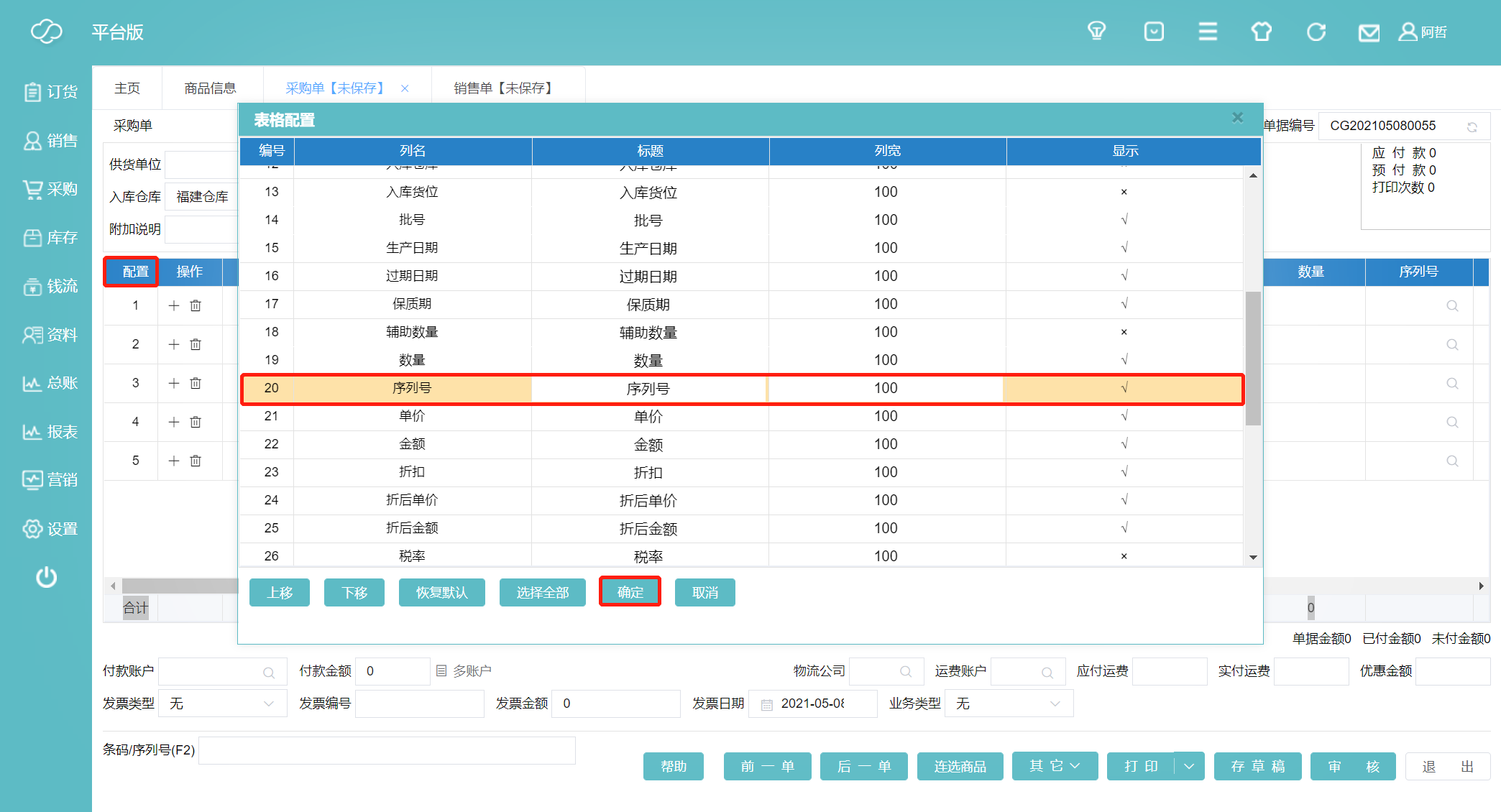 2、接着我们采购一批该商品,在采购单的配置里默认是不显示序列号的,我们需单击配置,在表格配置里找到序列号,双击“×”使其变成“√”,点击确定并保存。