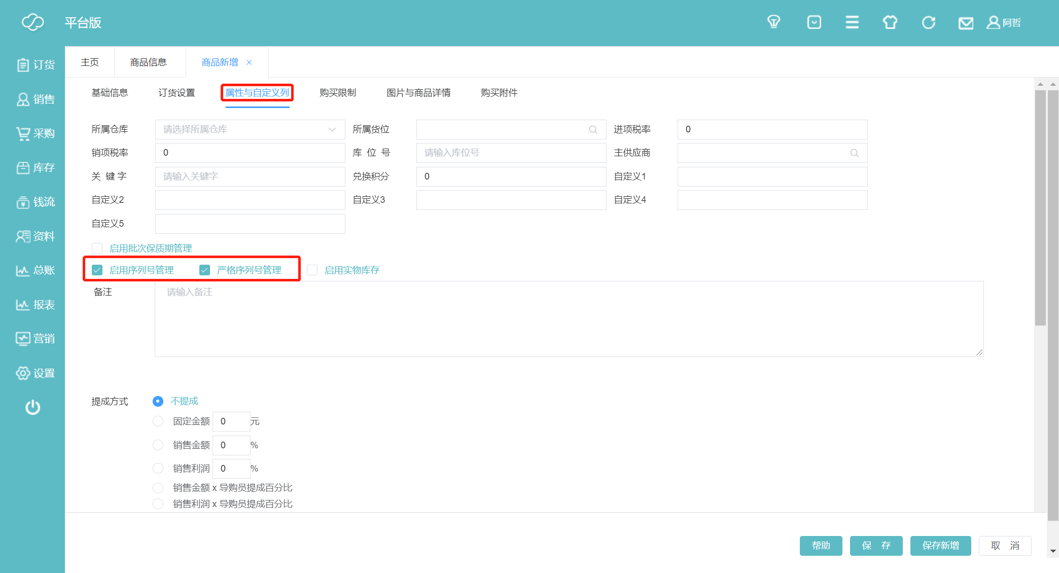 1、我们先创建一个商品,以手机为例。在商品信息的属性与自定义列选择启用序列号管理和严格序列号管理(开启严格序列号管理入库出库时需严格填写序列号)并保存。