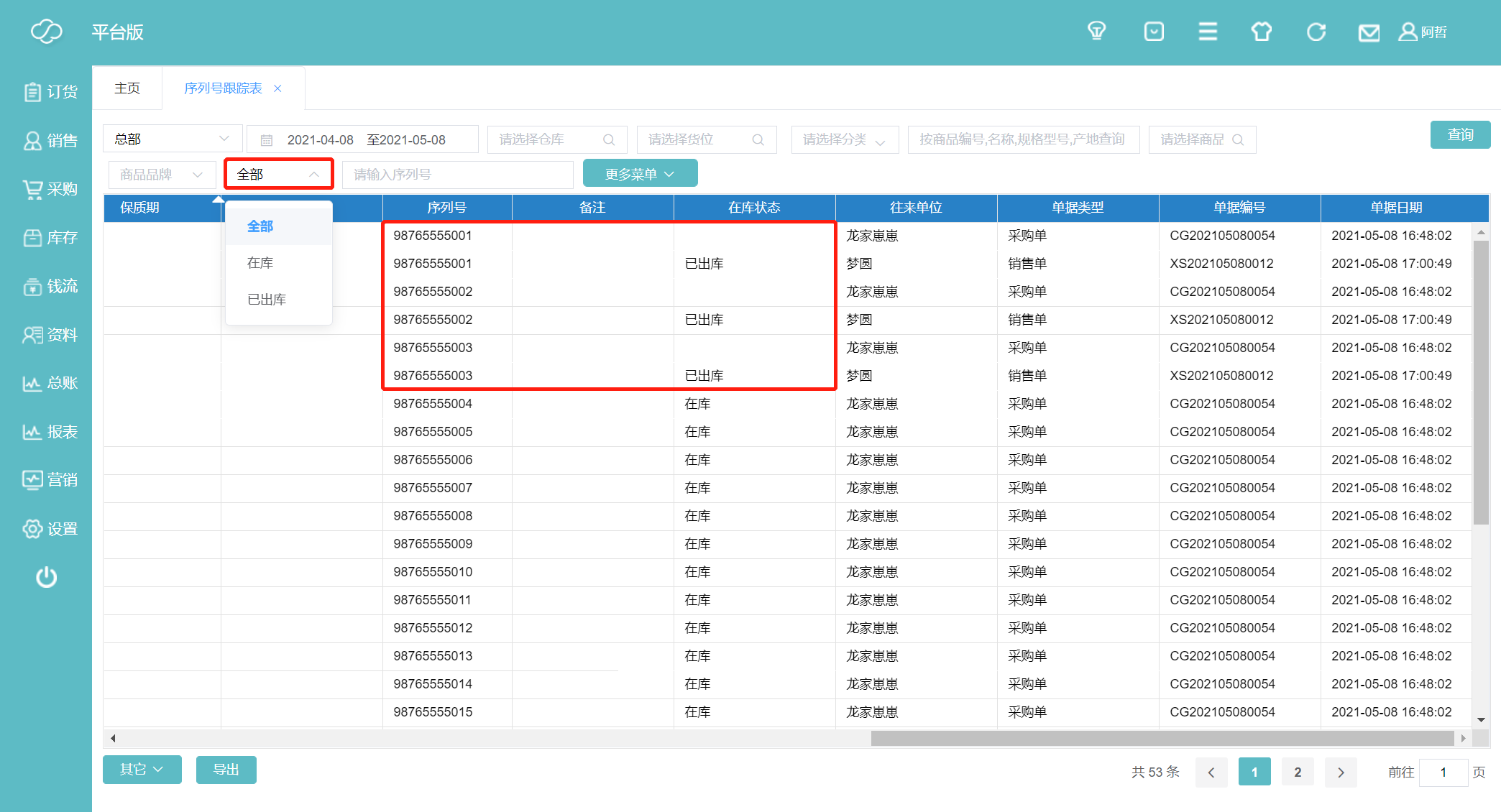 15、我们也可选择查看已出库的或全部的序列号状态表,下图是全部的。