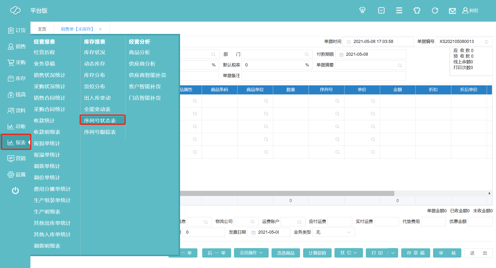 12、我们可以在报表—序列号状态表里查看序列号状态。