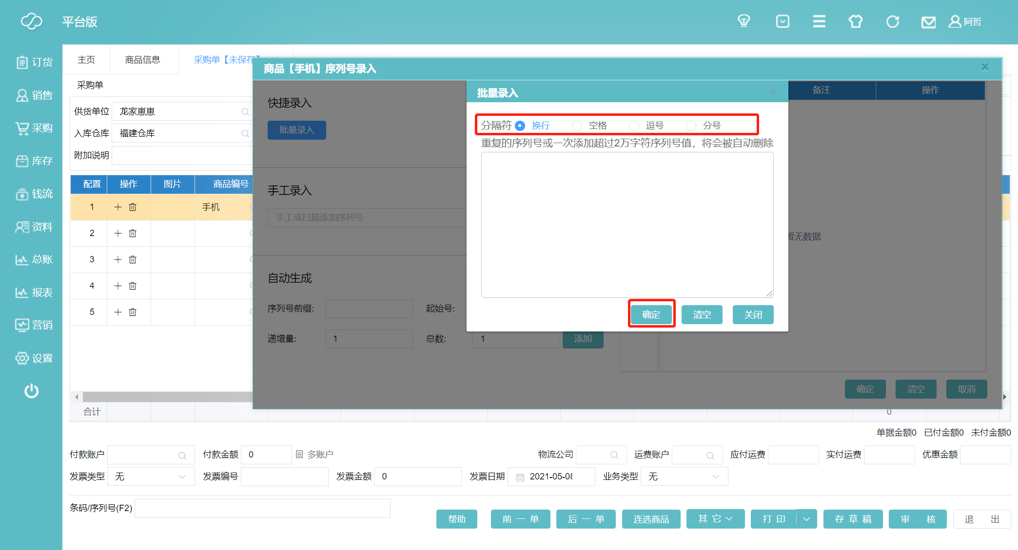 4、快捷录入/批量录入时我们可以选择换行、空格、逗号、分号四种分隔符。在空格里输入序列号,按回车自动分隔序列号,完成后点击确定。