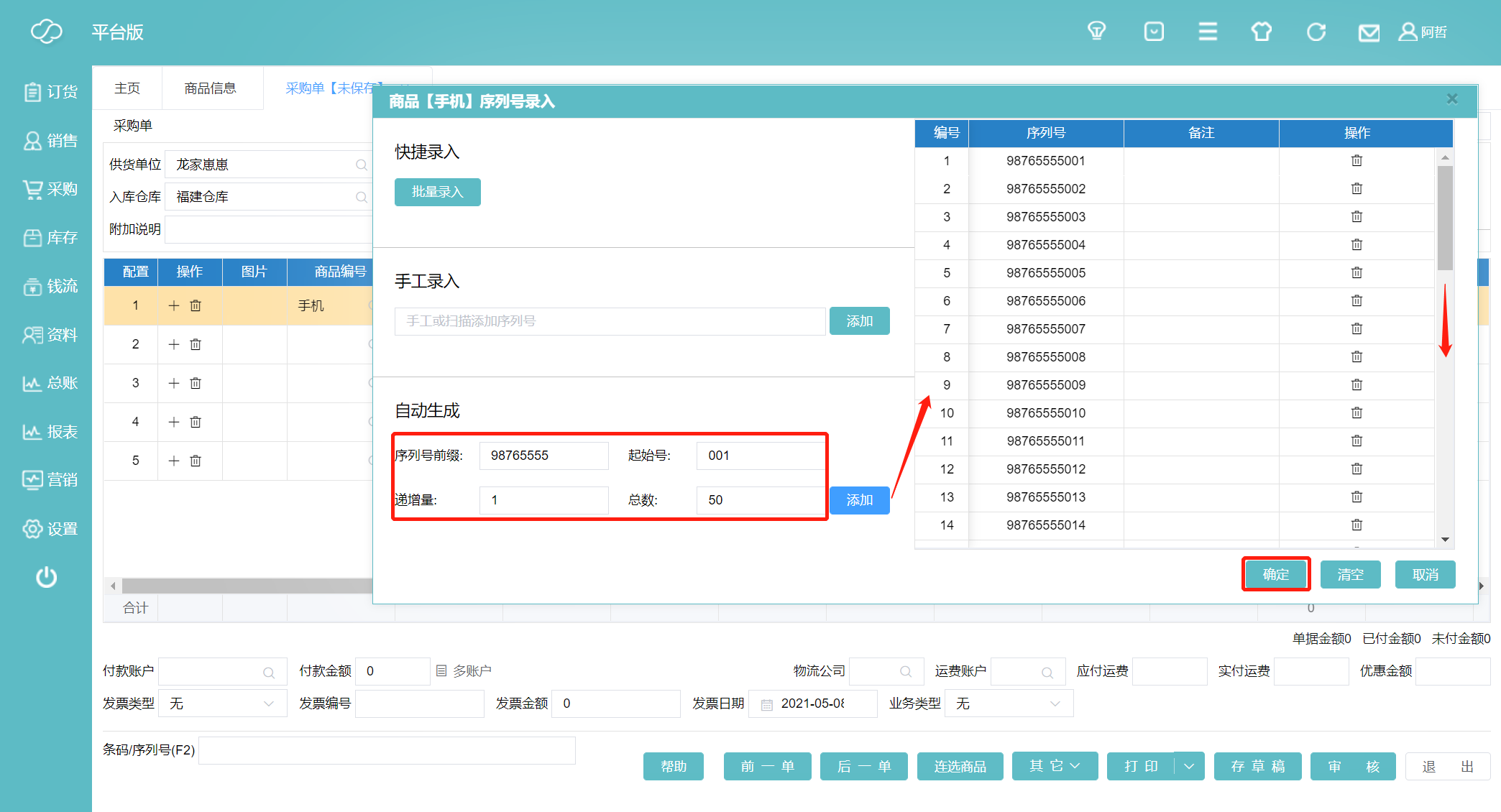 5、像手机这种序列号有规律的商品我们可以选择自动生成,输入序列号前缀,起始号码,递增量和总数(这里的总数默认就是我们采购的数量)填写数据点击添加。我们所需的序列号就会自动生成。这里我们采购的是前缀为98765555,起始号为001,递增量为1的商品50个。自动生成的序列号就是98765555001~98765555050。点击确定录入完成。