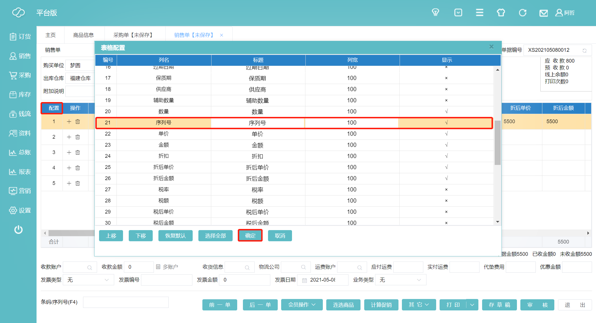 7、接着我们销售一批该货物,同理销售单的配置里默认也是不显示序列号的,我们需单击配置,在表格配置里找到序列号,双击“×”使其变成“√”,点击确定并保存。