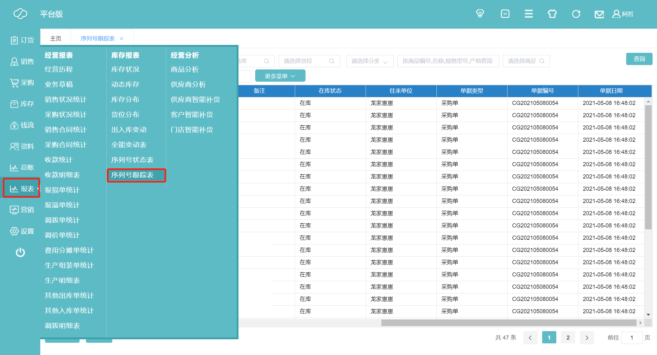 16、在报表—序列号跟踪表里可追踪序列号。