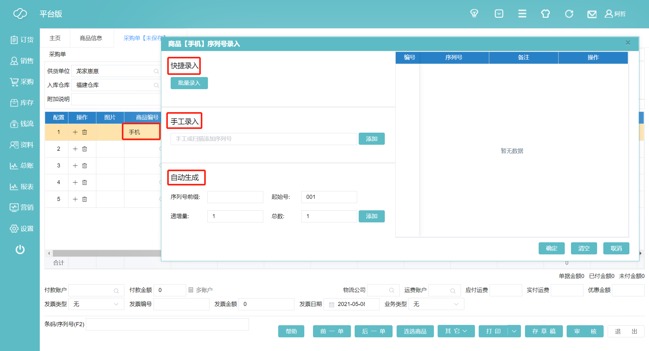 3、由于我们启用了严格序列号管理,在我们选择手机这个商品时会自动弹出商品【手机】序列号录入,我们有三种录入方式快捷录入、手工录入和自动生成。