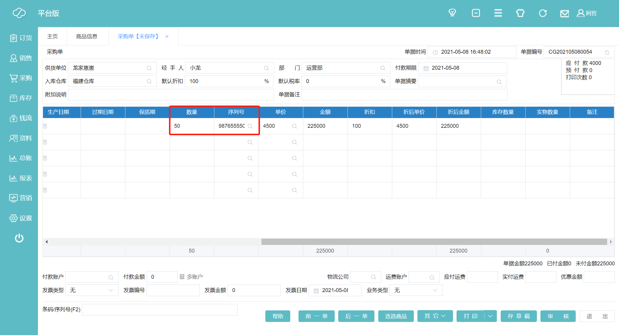 6、此时我们默认的采购数量就是50,点击序列号下面的小放大镜可查看序列号也可继续添加。点击审核采购完成。