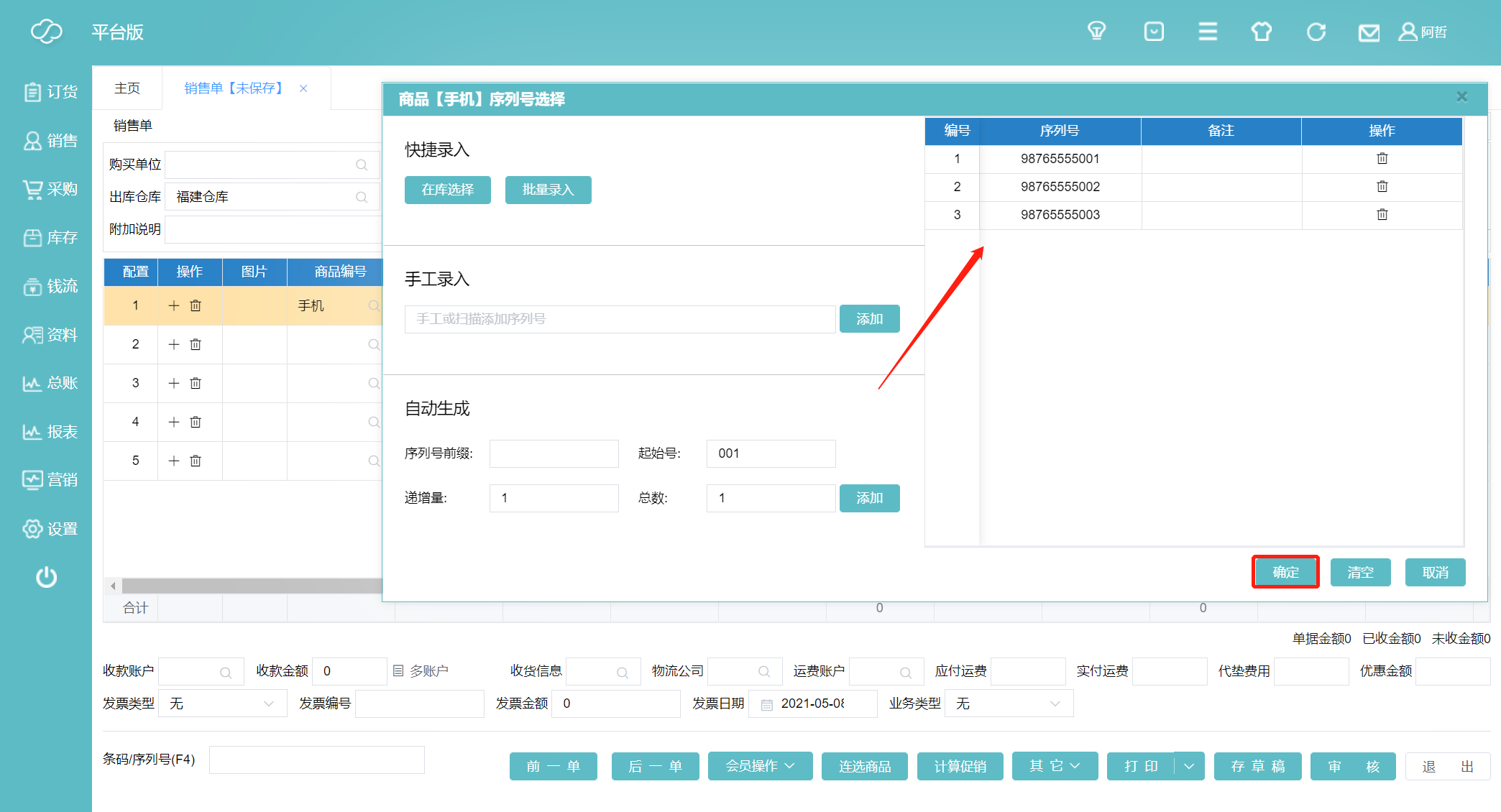 9、相比采购单,销售单可以在库选择,我们销售出序列号为001~003的三台手机。
