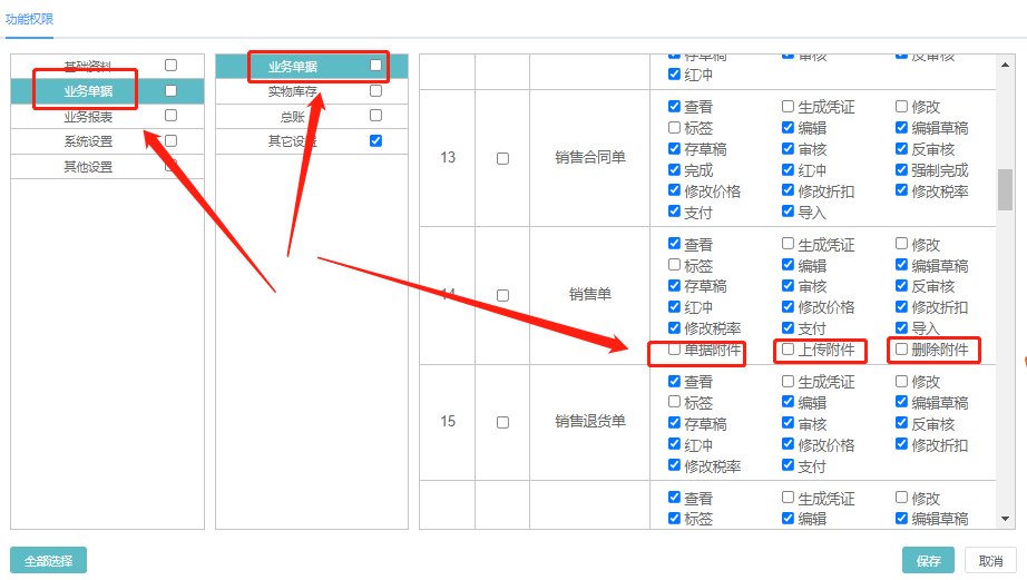 使用超级管理员账号登录后,通过设置-操作员列表-设置权限-业务单据-销售单,找到单据附件、上传附件、删除附件三个权限,根据需要点击勾选后保存即可赋予对应操作员使用权限;如需给予上传附件或删除附件权限,单据附件权限必须给予;