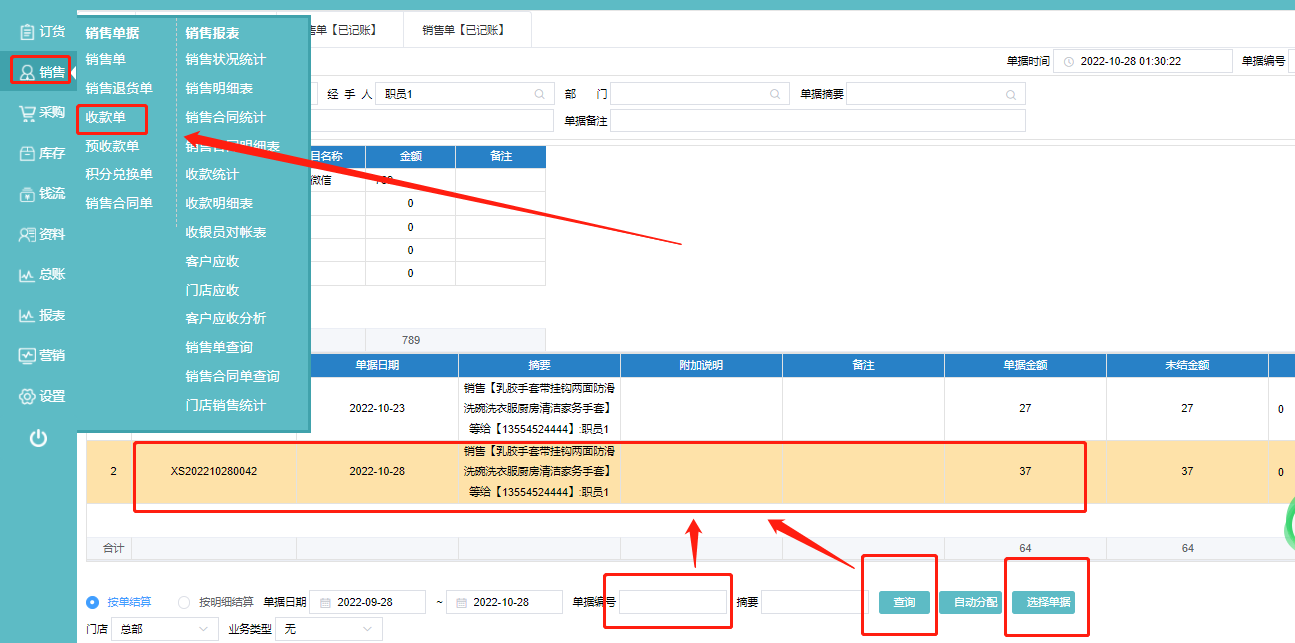 通过导航栏销售-收款单进行收款单新建,一般收款单对应到单据常用的结算方式为“按单结算”,可通过直接点击查询快速调出未收款的单据,或输入单据编号快速定位指定单据,也可通过选择单据多条件查询单据,无论哪种方式按单结算的单据选定后,可在收款单界面直接双击销售单进入销售单编辑界面,查询销售单里的单据附件,此时不影响收款单编辑,根据销售单附件内容方便收款单金额的分配管理。