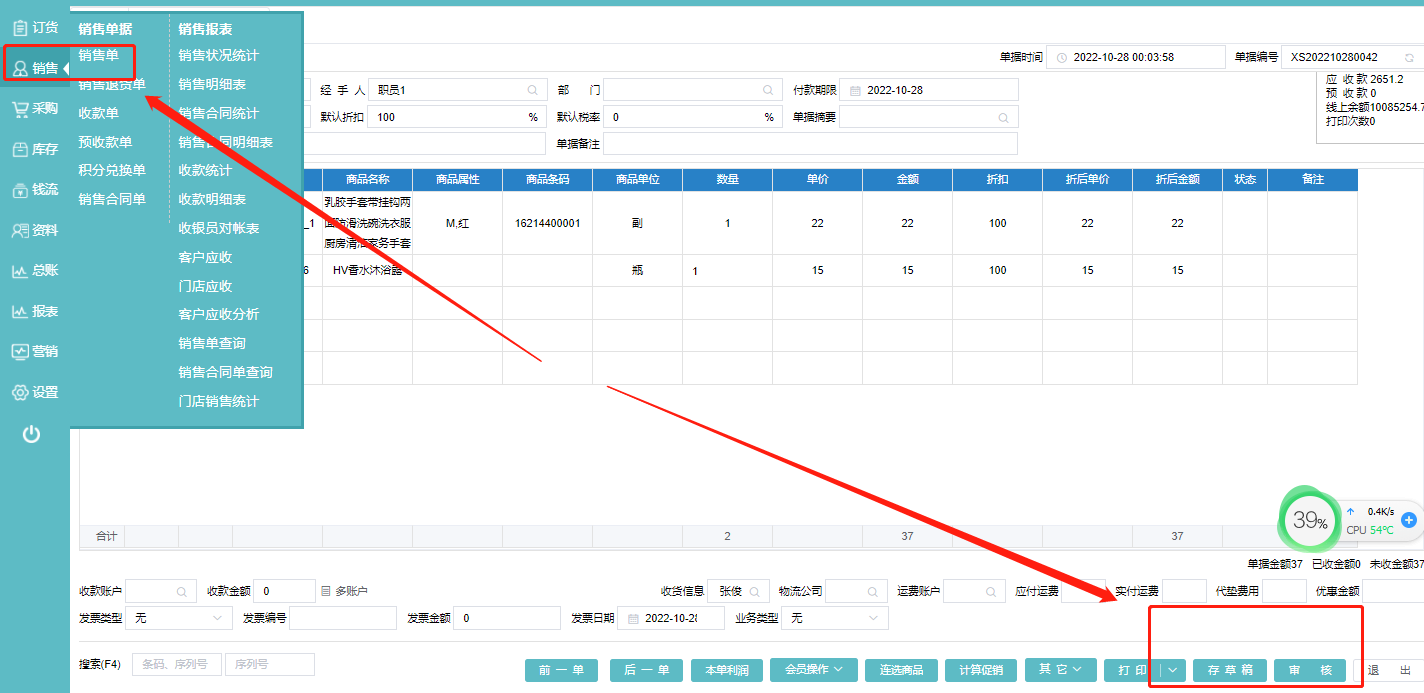 进入系统点击导航栏“销售”可进入销售单创建页面,根据实际业务创建销售单据,创建后确认无误需要保存销售单据,分为“存草稿”和“审核”,此步骤为基本操作销售单据步骤,也是使用单据附件功能的基础。